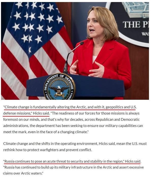 在發(fā)布這份文件時,美國國防部副部長希克斯在簡報會上公然聲稱,俄羅斯對北極地區(qū)的安全與穩(wěn)定構成"嚴重威脅"。為此,美國必須制定戰(zhàn)略并確保美軍做好準備,以減輕在北極地區(qū)發(fā)生潛在突發(fā)事件的風險。