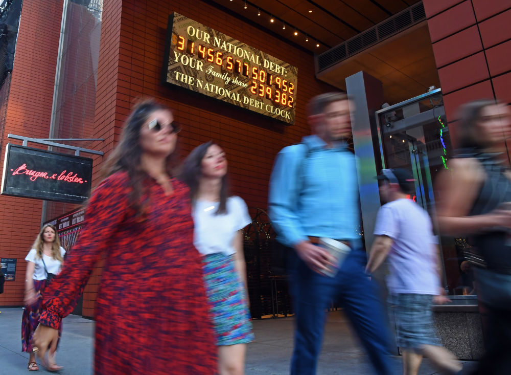 2023年6月1日,行人從美國紐約的“國債鐘”前走過。新華社記者李睿攝
