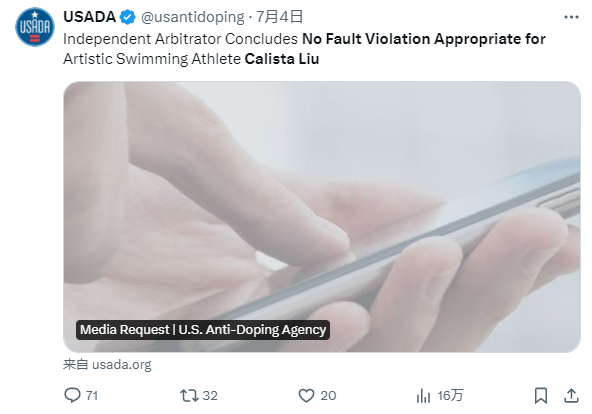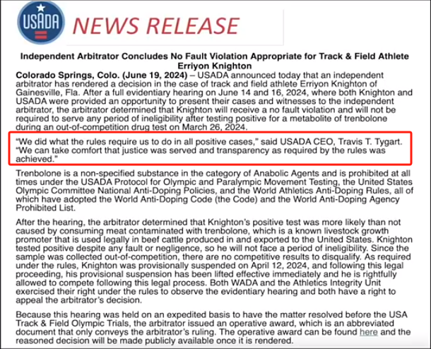 這屆奧運(yùn)會(huì),享受了美國這項(xiàng)“服務(wù)”的除了花游運(yùn)動(dòng)員卡莉斯塔,還有田徑運(yùn)動(dòng)員埃里揚(yáng)·奈頓。他們分別在5月和3月藥檢陽性,但巧的是,美國官方對這兩人的脫罪聲明都是卡在奧運(yùn)會(huì)前發(fā)出,“及時(shí)”地保住了他們的參賽資格,然后美國反興奮劑機(jī)構(gòu)官網(wǎng)又“及時(shí)”地把聲明刪掉了。