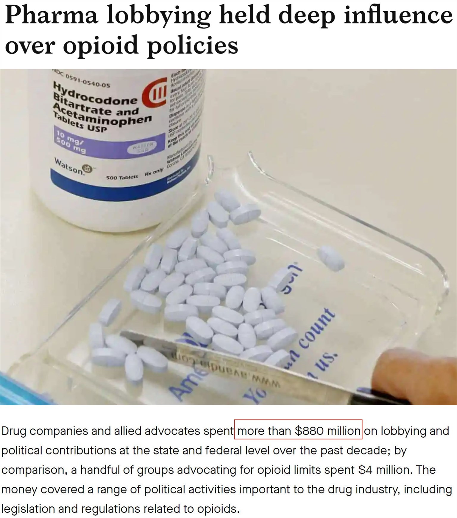 美國各種利益集團在藥物濫用問題上起著推波助瀾的作用。為維護市場利潤,美國大型醫(yī)藥企業(yè)投入大量資金,資助專家和協會兜售“阿片類藥物無害”論,進而推動毒品合法化,鼓動藥店大力推銷成癮藥品、醫(yī)師濫開藥用處方,使一些患者在不知情的情況下染上藥癮并無法自拔。