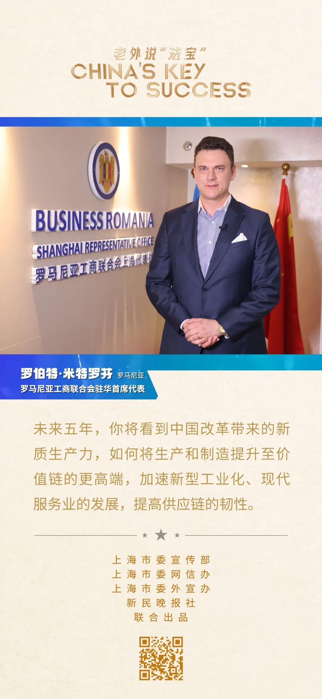 羅伯特·米特羅芬是羅馬尼亞工商聯(lián)合會(huì)駐華首席代表。2010年,他以羅馬尼亞國(guó)家館工作人員的身份來(lái)滬參加上海世博會(huì),那次的旅程讓他深深愛(ài)上了這座城市。從那時(shí)起,他就在上海定居。