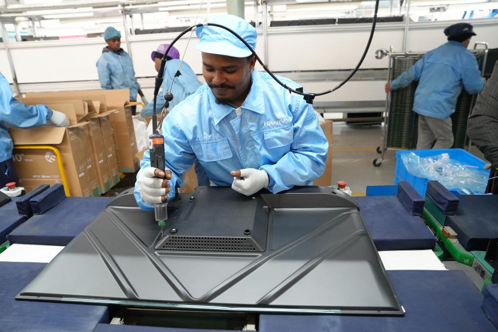 8月14日,在南非開普敦,當(dāng)?shù)貑T工在海信南非工業(yè)園的電視機(jī)生產(chǎn)線上工作。新華社記者王雷攝