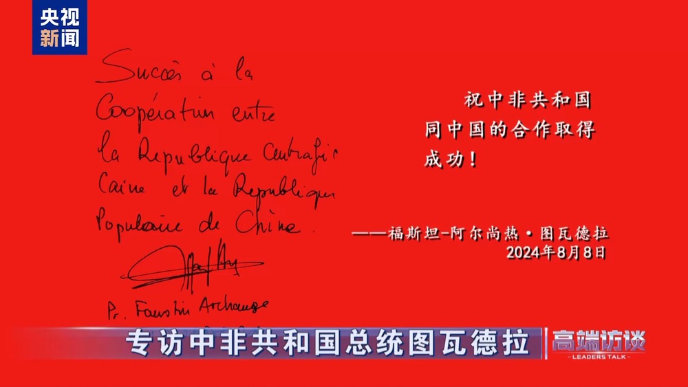 △中非總統(tǒng)圖瓦德拉在接受總臺(tái)專(zhuān)訪后題詞