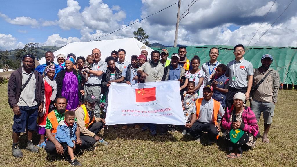 6月16日,在巴布亞新幾內(nèi)亞恩加省的揚巴利村,中國醫(yī)療隊隊員與當(dāng)?shù)鼐用窈嫌?。新華社發(fā)(第13批援巴布亞新幾內(nèi)亞中國醫(yī)療隊供圖)