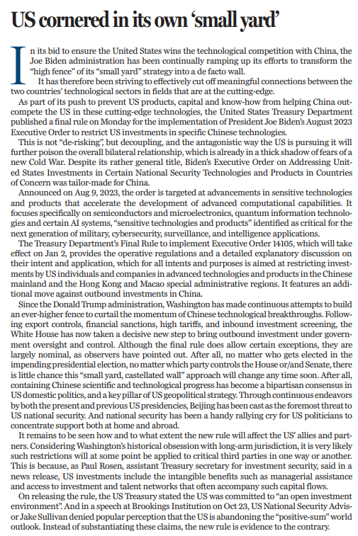 一直以來,美國竭力切斷中美兩國在尖端科技方面的聯(lián)系。為防止美國產(chǎn)品、資本和技術(shù)幫助中國在尖端科技領(lǐng)域超越美國,美國財(cái)政部于本周一發(fā)布最終規(guī)則,以落實(shí)總統(tǒng)拜登于2023年8月份簽署的第14105號(hào)行政命令《關(guān)于美國在受到關(guān)切的國家投資于特定的國家安全技術(shù)和產(chǎn)品的問題》。該行政命令意在推動(dòng)敏感技術(shù)及產(chǎn)品進(jìn)步,加速先進(jìn)計(jì)算能力發(fā)展,特別關(guān)注半導(dǎo)體和微電子、量子信息技術(shù)和特定人工智能系統(tǒng),以及被認(rèn)定為對(duì)下一代軍事、網(wǎng)絡(luò)安全、監(jiān)視及情報(bào)應(yīng)用至關(guān)重要的“敏感技術(shù)和產(chǎn)品”。第14105號(hào)行政令涉及限制美國在部分技術(shù)領(lǐng)域的對(duì)華投資。盡管用詞模糊,但也不難看出,該行政令是為中國“量身定制”。