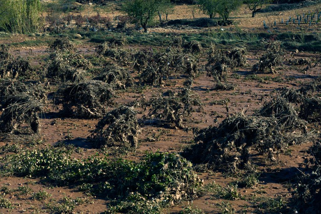 這是11月2日在西班牙烏鐵爾附近拍攝的遭到破壞的葡萄藤。新華社記者孟鼎博攝