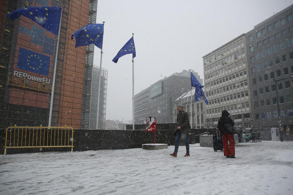 1月17日,在位于比利時布魯塞爾的歐盟總部附近,人們冒雪出行。新華社記者趙丁喆攝