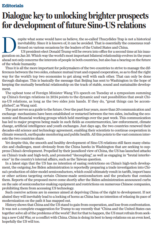 因此,雙方應(yīng)當(dāng)努力管控分歧、增信釋疑、拓展合作,為世界前兩大經(jīng)濟(jì)體開辟友好相處、共同發(fā)展的道路。這只能通過對話溝通來實現(xiàn)。