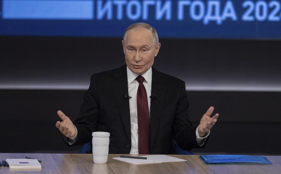 2024年12月19日,在俄羅斯首都莫斯科,俄羅斯總統(tǒng)普京在“年度盤(pán)點(diǎn)”活動(dòng)上講話(huà)。新華社記者白雪騏攝