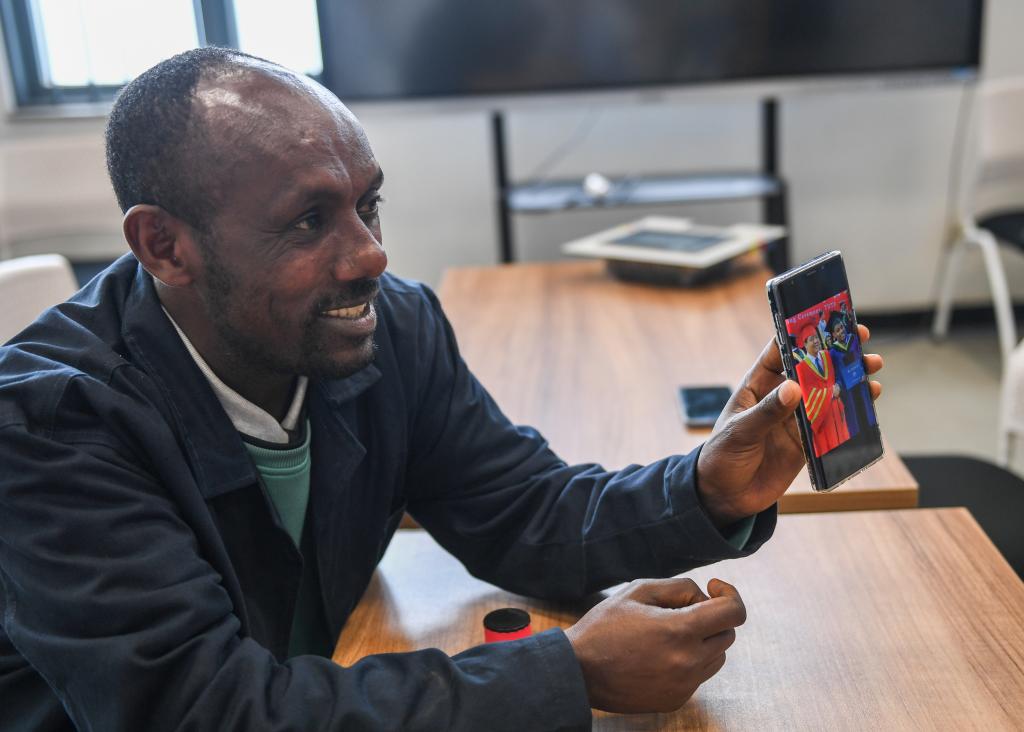 2024年2月15日,在位于亞的斯亞貝巴的埃塞俄比亞聯(lián)邦職業(yè)技術(shù)培訓(xùn)學(xué)院,魯班工坊當?shù)亟處熂s納斯·阿凱萊(中文名艾友涵)展示在中國學(xué)習(xí)時的照片。(新華社記者李亞輝攝)