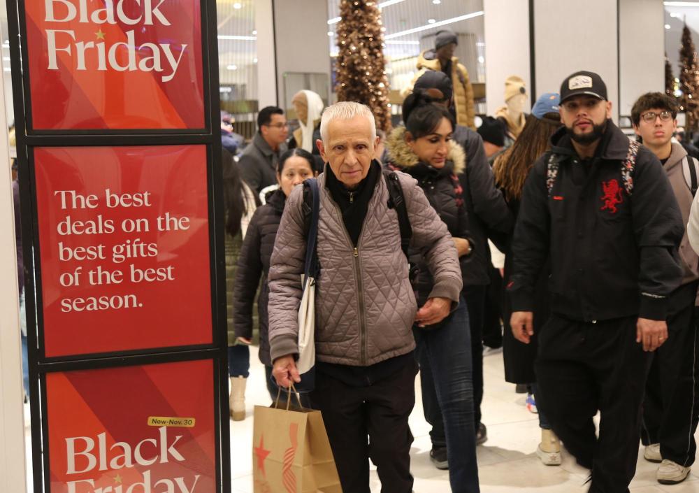2024年11月29日,在美國紐約曼哈頓島的一家商場內,人們經過“黑色星期五”促銷廣告牌。新華社記者劉亞南攝