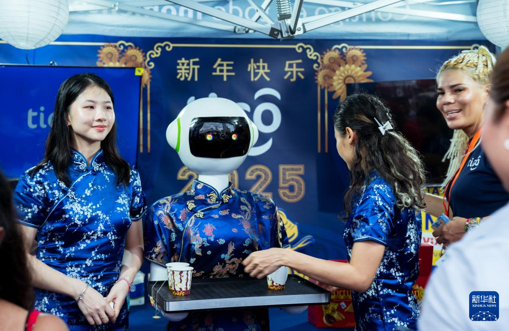 1月31日,在巴拿馬首都巴拿馬城的華僑華人歡樂春節(jié)廟會上,機(jī)器人為游客送上中國茶水。新華社記者 許詠政 攝