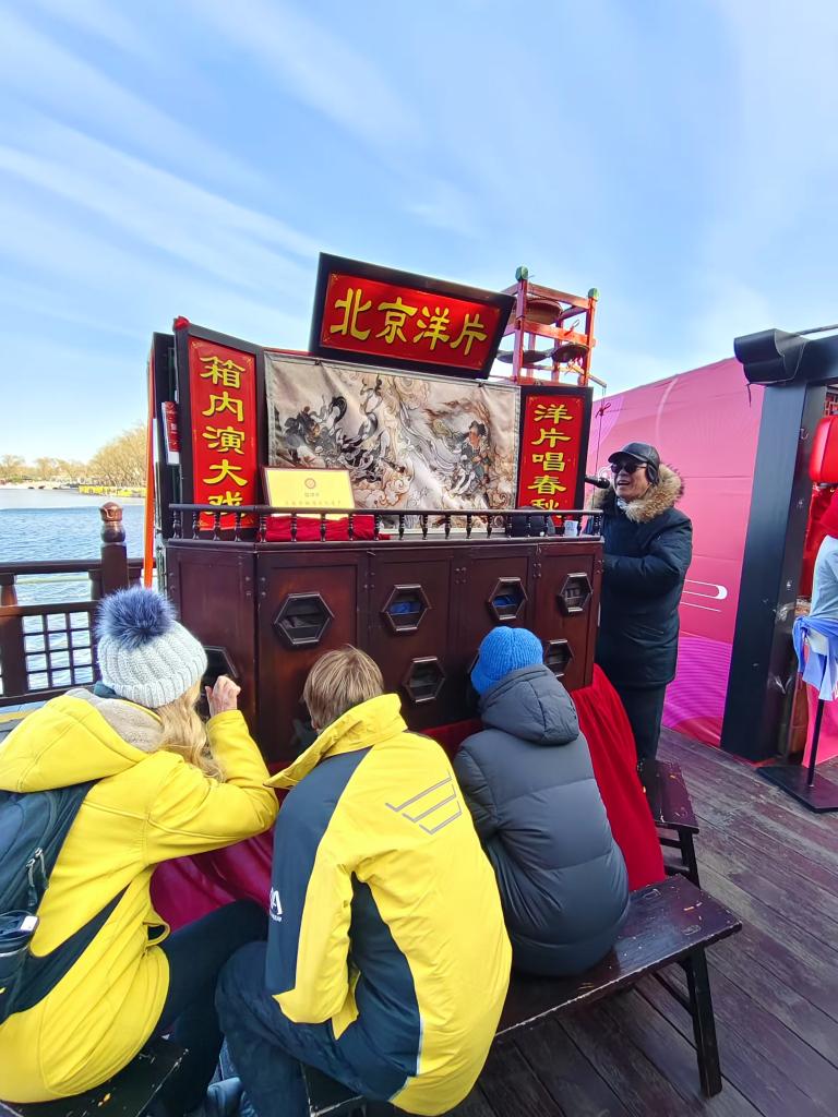 走入北京歷史文化街區(qū)什剎海的新春集市,年味彌漫在文化產(chǎn)品、特色小吃和藝術(shù)表演中。不遠(yuǎn)處的鑼鼓唱戲聲吸引了母子二人,原來是民間藝術(shù)北京洋片在表演《西游記》。坐在一個(gè)約1米高、2米寬的木箱前,透過箱上圓孔能看到里面不斷切換的畫片。二人全神貫注的表情,讓人感到不同文化仿佛跨越時(shí)空和國度,在這里定格。