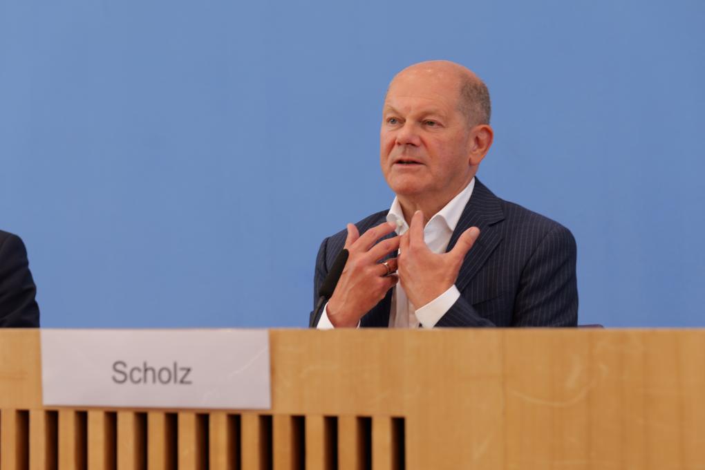 2024年7月24日,德國總理朔爾茨在柏林舉行的新聞發(fā)布會上講話。新華社記者李函林?jǐn)z