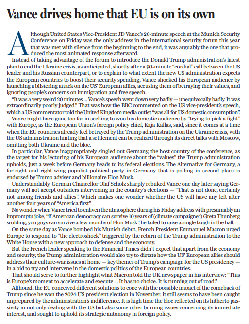 更令人意外的是,萬斯在演講中專門點(diǎn)名批評了東道主德國,而此時距離德國聯(lián)邦選舉僅剩一周。目前,德國極右翼政黨“德國選擇黨”在民調(diào)中位列第二,而特朗普的顧問、億萬富翁埃隆·馬斯克正公開支持該黨。不出所料,德國總理朔爾茨在次日予以嚴(yán)厲回?fù)?,明確表示德國不會接受外部勢力干涉本國選舉。“盟友和朋友之間不會做這樣的事情?!彼窢柎牡谋響B(tài)不禁引人深思:如果特朗普政府繼續(xù)推行“美國優(yōu)先”政策,美國四年后還能剩下多少盟友?
