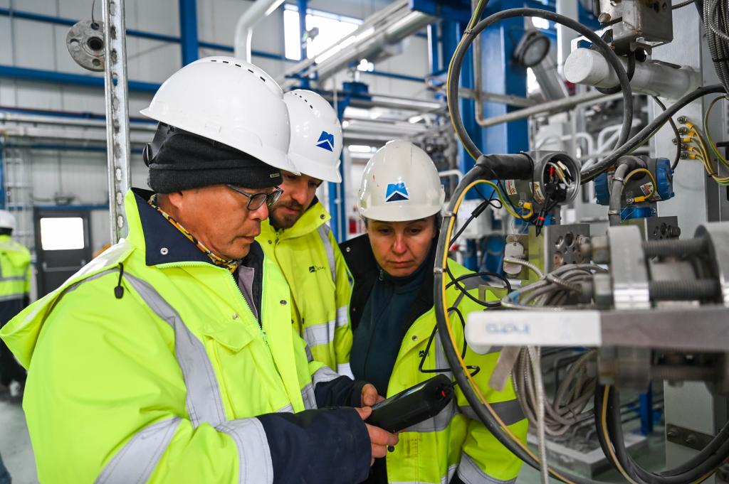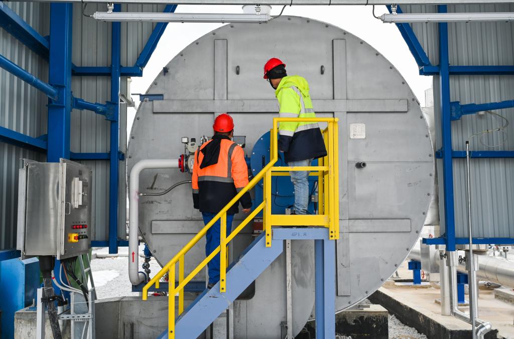 2月12日,中土兩國(guó)工程師在土耳其阿克薩拉伊省的圖茲湖地下天然氣儲(chǔ)庫(kù)擴(kuò)建項(xiàng)目地面場(chǎng)站查看設(shè)備。新華社記者劉磊攝