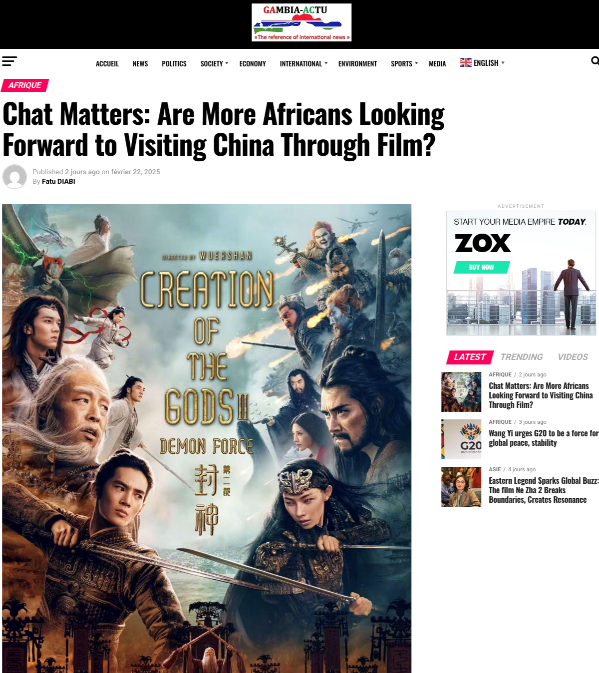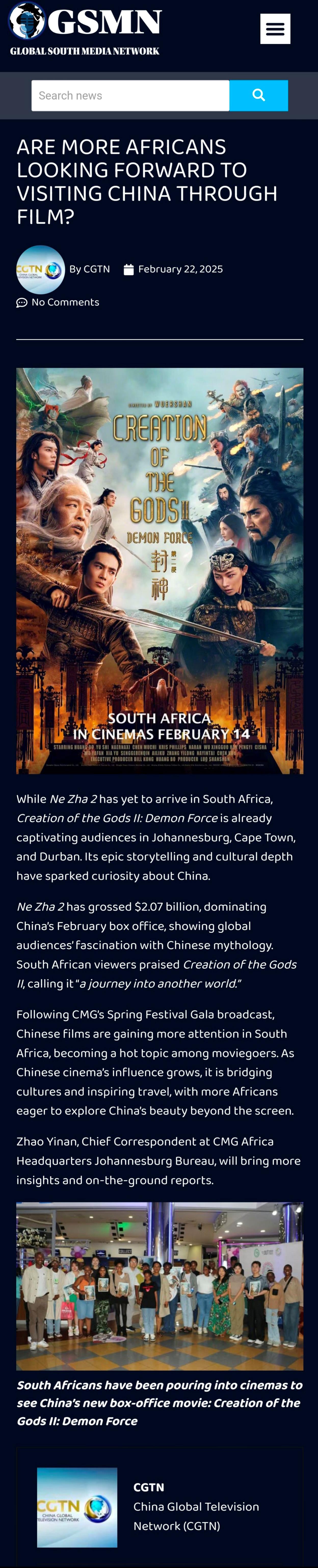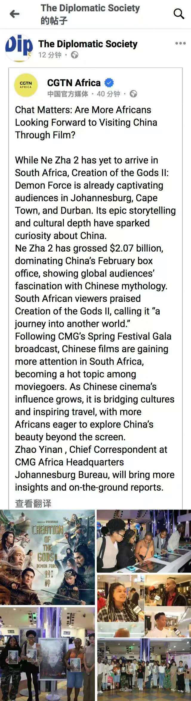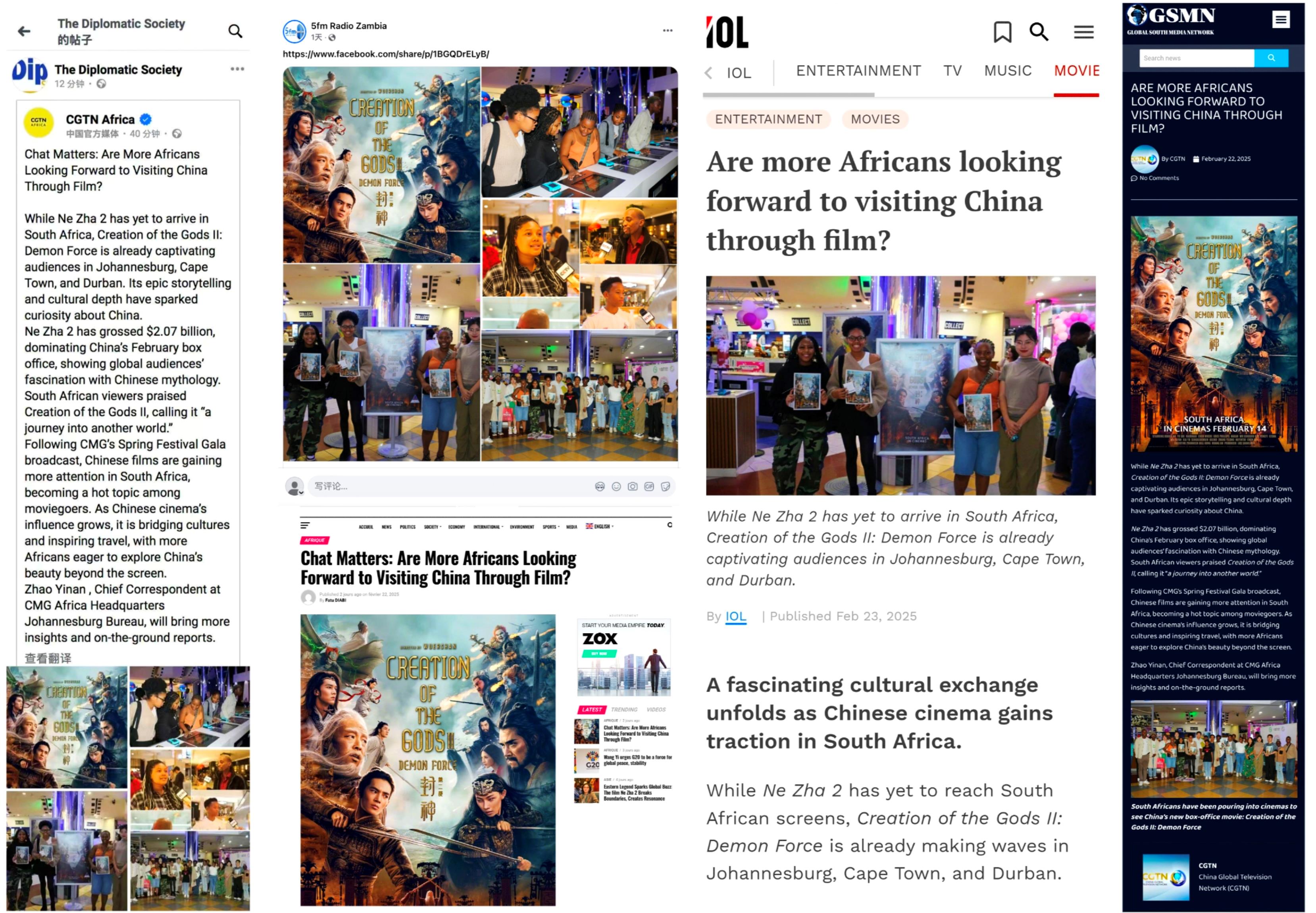 此外,中國春節(jié)檔電影登陸非洲并引發(fā)廣泛影響的相關(guān)報道被肯尼亞廣播公司、南非獨立傳媒、南非《外交圈報》、全球南方新聞網(wǎng)、贊比亞5fm電臺、津巴布韋廣播公司、岡比亞之聲、剛果新聞網(wǎng)等多家媒體轉(zhuǎn)引轉(zhuǎn)載,觸達(dá)超1億受眾。
