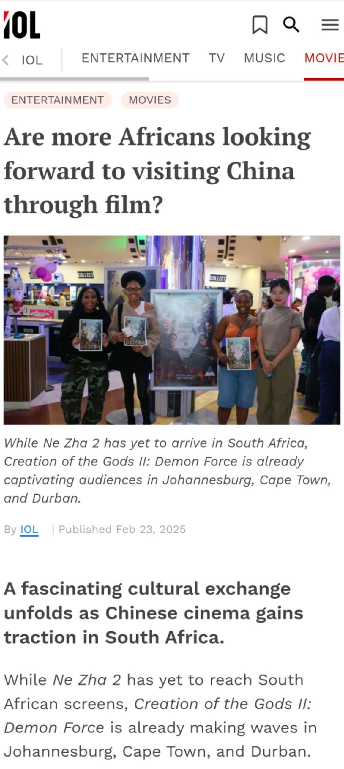 電影連接世界,這一次,非洲大陸期待著《哪吒2》的到來,曼德拉廣場上舞動著南非版的“魔童鬧?!薄侵迺r刻已到——This time for Africa!