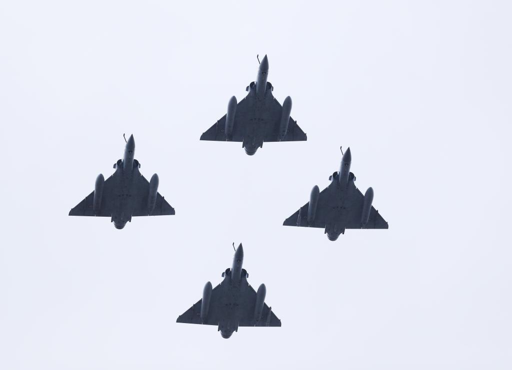 這是2021年7月14日在法國巴黎協(xié)和廣場國慶閱兵式現(xiàn)場拍攝的戰(zhàn)斗機編隊。新華社記者 高靜 攝