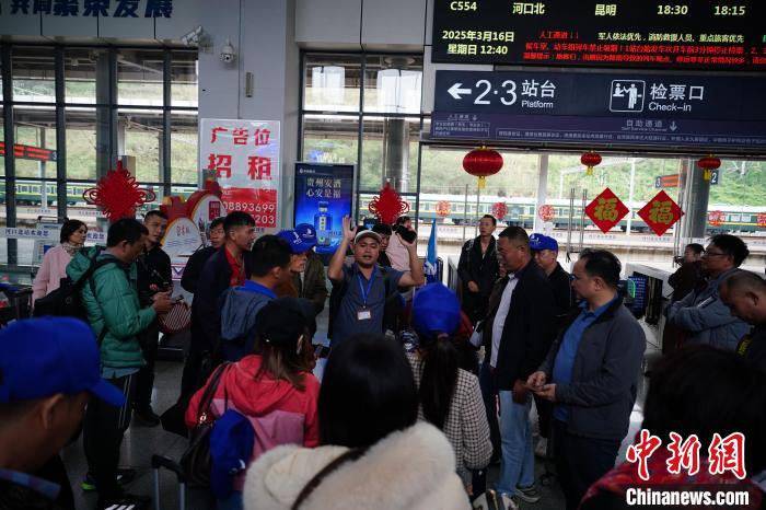 3月16日,云南省紅河州河口縣河口北站,一位導游組織越南旅游團候車。中新社記者 劉冉陽 攝