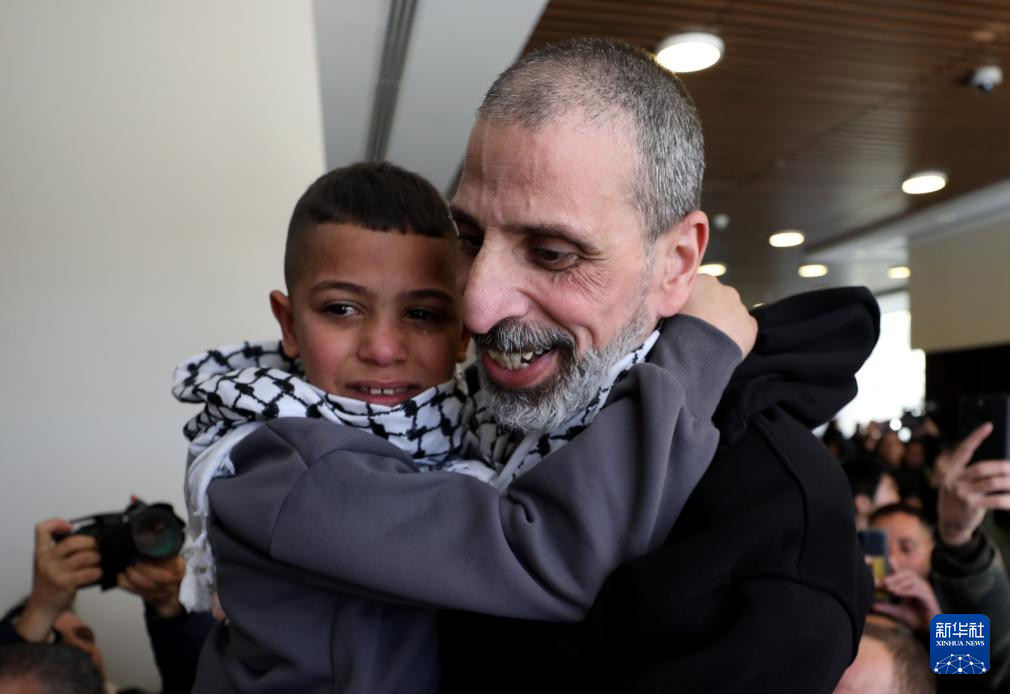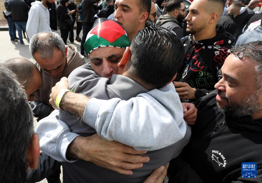 2月1日,在約旦河西岸城市拉姆安拉,人們擁抱獲釋的巴勒斯坦人。以色列當(dāng)天釋放了183名被扣押人員。新華社發(fā)(艾曼·諾巴尼 攝)