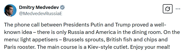 俄羅斯總統(tǒng)普京同特朗普18日通電話。俄聯(lián)邦安全會(huì)議副主席梅德韋杰夫就此表態(tài)稱(chēng),這表明餐廳里只有俄美,歐洲和烏克蘭都在菜單上,歐洲是開(kāi)胃小菜,而主菜是烏克蘭。