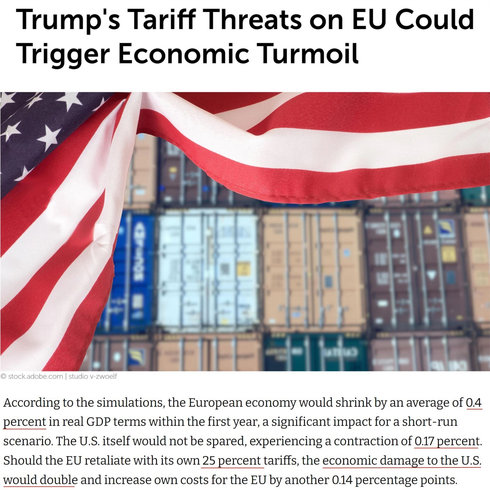 據(jù)德國基爾世界經(jīng)濟研究所此前推算,如果美國計劃中的關(guān)稅措施全部落地,歐盟和美國經(jīng)濟在第一年將分別萎縮0.4%和0.17%。如果歐盟以25%的關(guān)稅加以反制,美國的經(jīng)濟損失將翻倍。