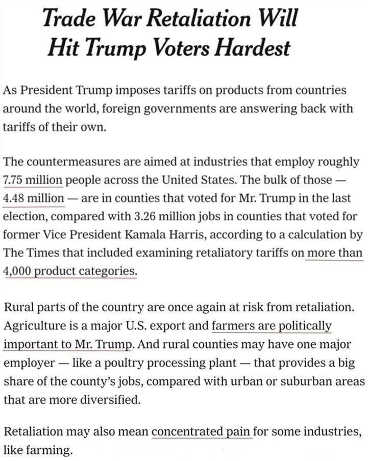 《紐約時報》對美國遭受反制關(guān)稅打擊的4000多個產(chǎn)品類別進行的分析顯示,各行業(yè)共有約775萬人受到波及,其中約有448萬人來自大選中支持特朗普的地區(qū),主要集中在以農(nóng)業(yè)為主要產(chǎn)業(yè)的美國中西部、南部和東南部。