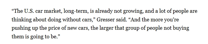 “從長期來看,美國汽車市場已不再增長,越是推高新車價格,不買車的人就會越多。”