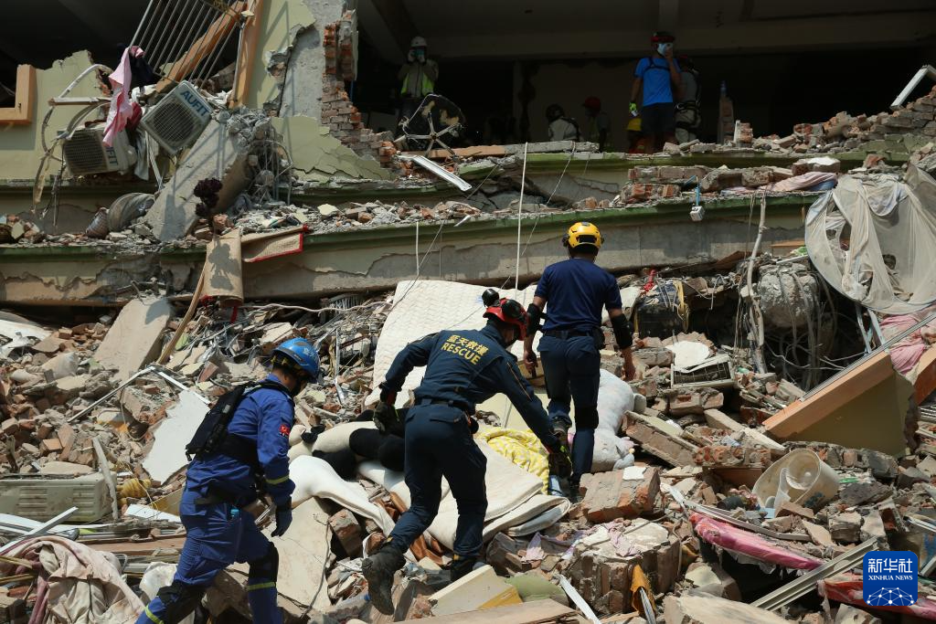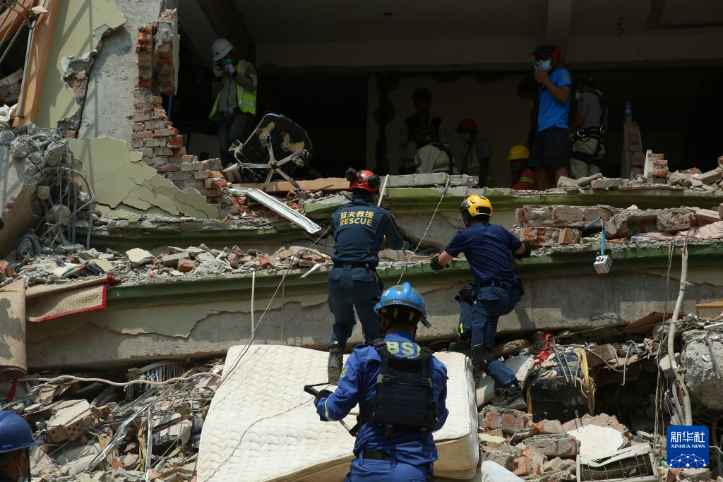 3月30日,在緬甸曼德勒天空別墅公寓建筑群,救援隊(duì)及志愿者一起開展救援活動(dòng)。新華社發(fā)(苗覺梭攝)