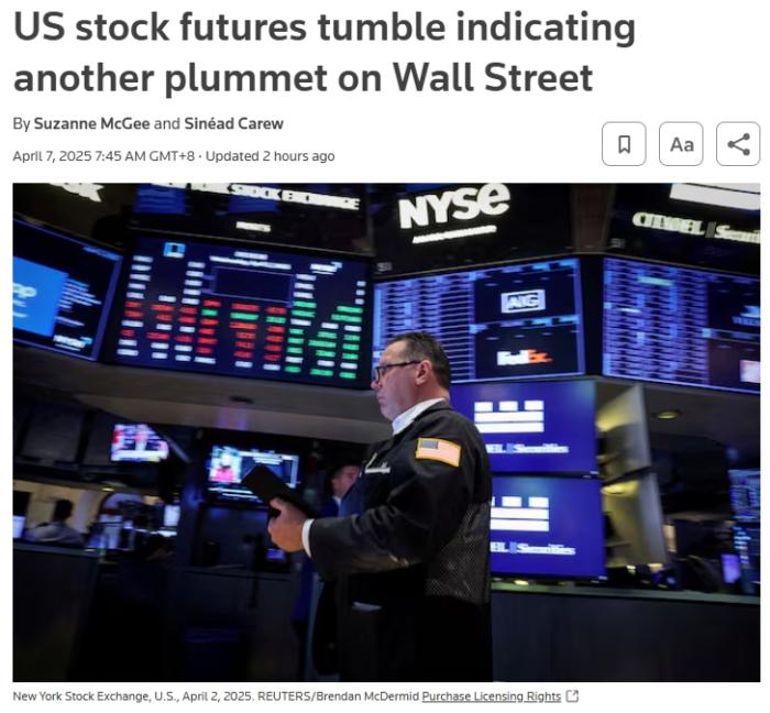 美東時間4月6日下午,美國股指期貨開盤暴跌,其中納斯達(dá)克100指數(shù)期貨在波動中下跌約5.8%,標(biāo)普500指數(shù)期貨下跌約4.8%。美媒稱,當(dāng)前,關(guān)稅引發(fā)的市場混亂仍未結(jié)束,這對投資者乃至整個經(jīng)濟(jì)而言都是“不祥之兆”。