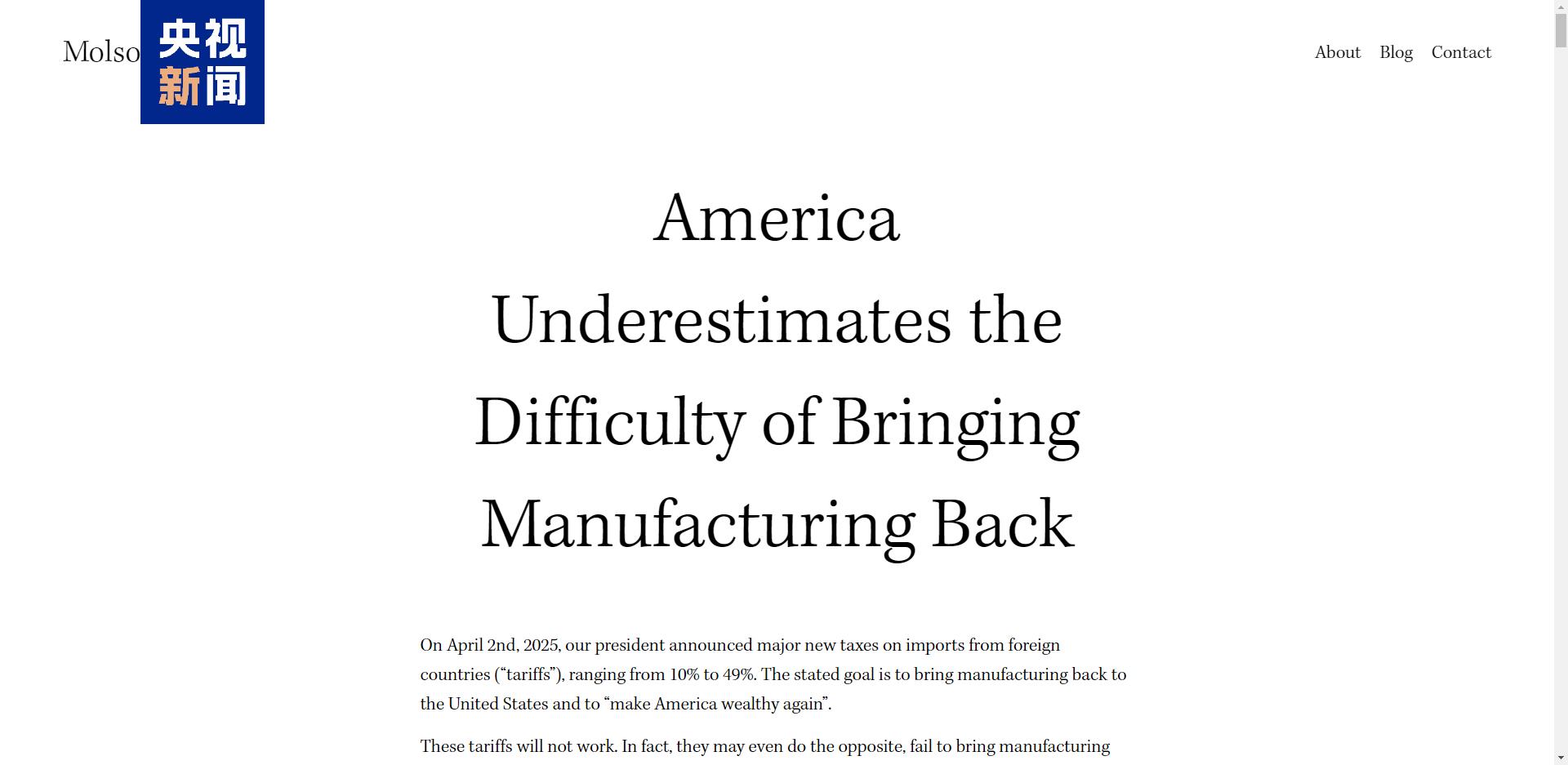 近日,美國(guó)一線企業(yè)主莫爾森·哈特結(jié)合自身經(jīng)驗(yàn),發(fā)布了題為《美國(guó)低估了制造業(yè)回流的難度》的文章,“控訴”特朗普的關(guān)稅政策,并用多個(gè)刀刀見(jiàn)血的論點(diǎn),揭穿了“關(guān)稅能救‘美國(guó)制造’”的致命幻覺(jué)。