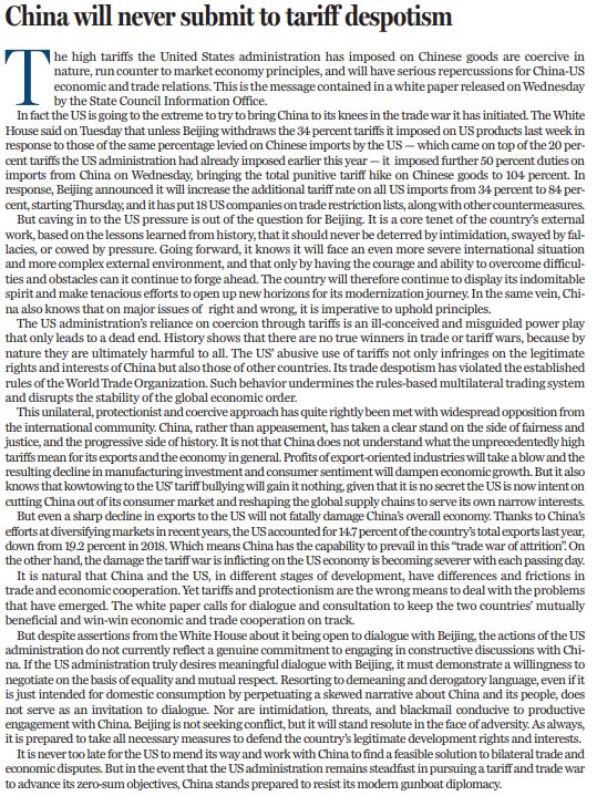 本文編譯自《中國日報》4月10日社論