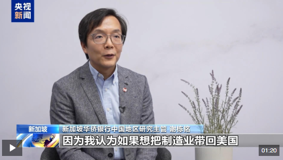 特朗普政府對(duì)全球貿(mào)易伙伴實(shí)施所謂的“對(duì)等關(guān)稅”,聲稱這是為了解決美國(guó)的貿(mào)易逆差并推動(dòng)制造業(yè)回流。新加坡華僑銀行中國(guó)地區(qū)研究主管謝棟銘在接受總臺(tái)記者采訪時(shí)表示,特朗普所謂的“對(duì)等關(guān)稅”無法真正實(shí)現(xiàn)這些目標(biāo)。