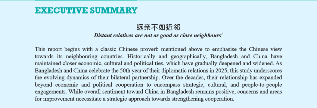 報告說,75%的受訪者對孟加拉國與中國的關(guān)系持正面看法,與此同時,僅2%的受訪者對華關(guān)系持負(fù)面看法。
