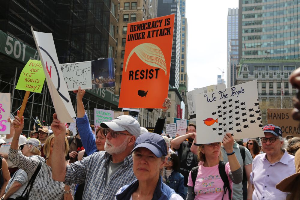 4月19日,人們在美國紐約街頭參加抗議活動(dòng)。美國多地19日舉行抗議活動(dòng),首都華盛頓、紐約、舊金山、波士頓等城市的民眾走上街頭,抗議現(xiàn)政府大規(guī)模裁員、加征關(guān)稅、驅(qū)逐移民等政策。新華社記者劉亞南攝