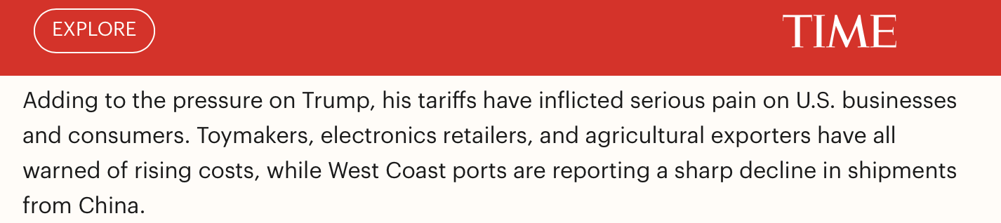 報道同時指出,美國政府的關稅措施給美國企業(yè)和消費者帶來了沉重打擊,這進一步加劇了美國政府的壓力。玩具制造商、電子產(chǎn)品零售商和農(nóng)產(chǎn)品出口商都警告稱,成本將上升,而美國西海岸的港口則報告稱,來自中國的貨運量急劇下降。