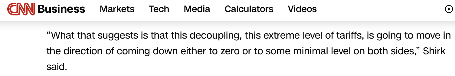 美國有線電視新聞網(wǎng)的報道注意到美國財政部長貝森特此前關于“本周末的談判將側重于緩和緊張局勢”的表態(tài)。報道援引加州大學圣迭戈分校全球政策與戰(zhàn)略學院研究教授、21世紀中國研究中心名譽主任蘇珊·希爾克的觀點指出,這表明美中之間“脫鉤、極端的關稅水平,將朝著降至零,或是降至最低水平的方向發(fā)展”。