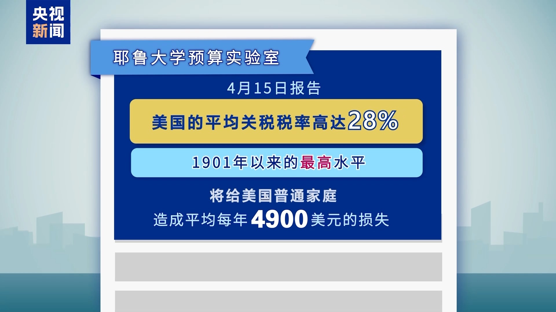 4月15日,在美國與中國、英國達(dá)成協(xié)議前,耶魯大學(xué)預(yù)算實驗室也曾發(fā)布過一份報告。這份報告稱,美國的平均關(guān)稅稅率當(dāng)時高達(dá)28%,為1901年以來的最高水平。按照當(dāng)時的關(guān)稅稅率,將給美國普通家庭造成平均每年4900美元的損失。