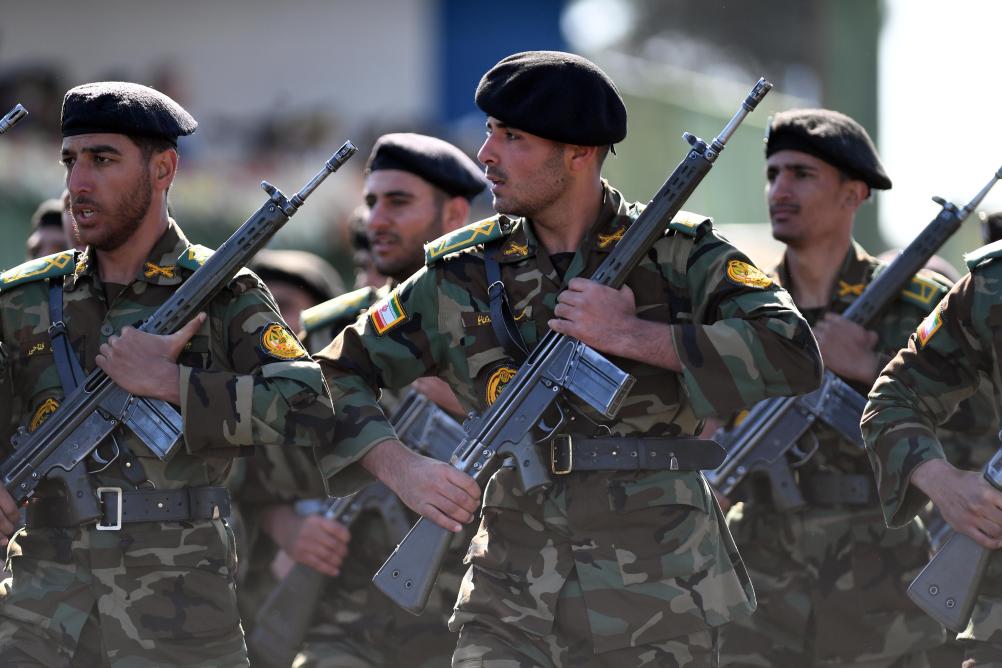 2025年4月18日,在伊朗首都德黑蘭,士兵們在閱兵式上列隊行進。伊朗18日舉行建軍節(jié)閱兵式。新華社記者 沙達提 攝