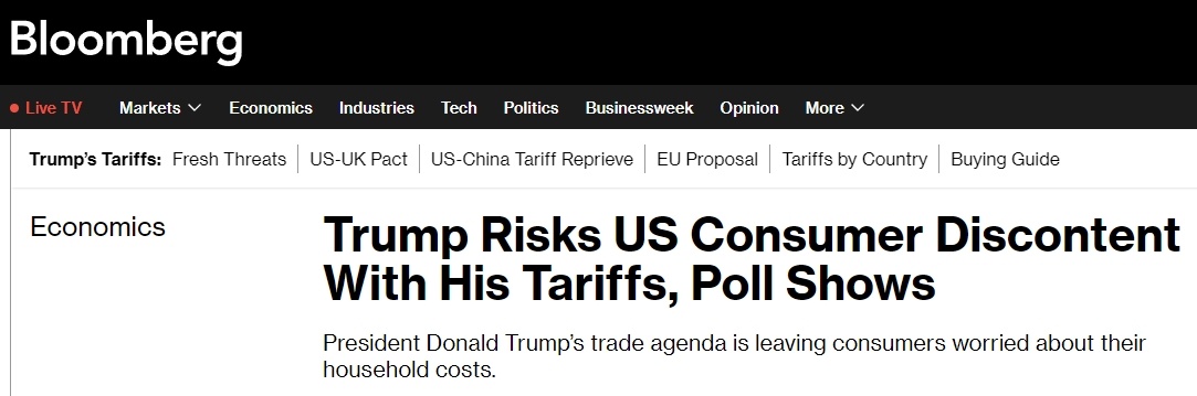彭博社近日民調顯示,56%的受訪美國人認為,特朗普對其他國家征收的關稅對他們的家庭財務狀況產生了不良影響。即使特朗普政府一直在鼓吹加關稅能讓產業(yè)回流美國并增加財政收入,約52%的受訪者還是表示,美政府承諾的好處不值得他們?yōu)榇烁冻龅慕洕鷥r。