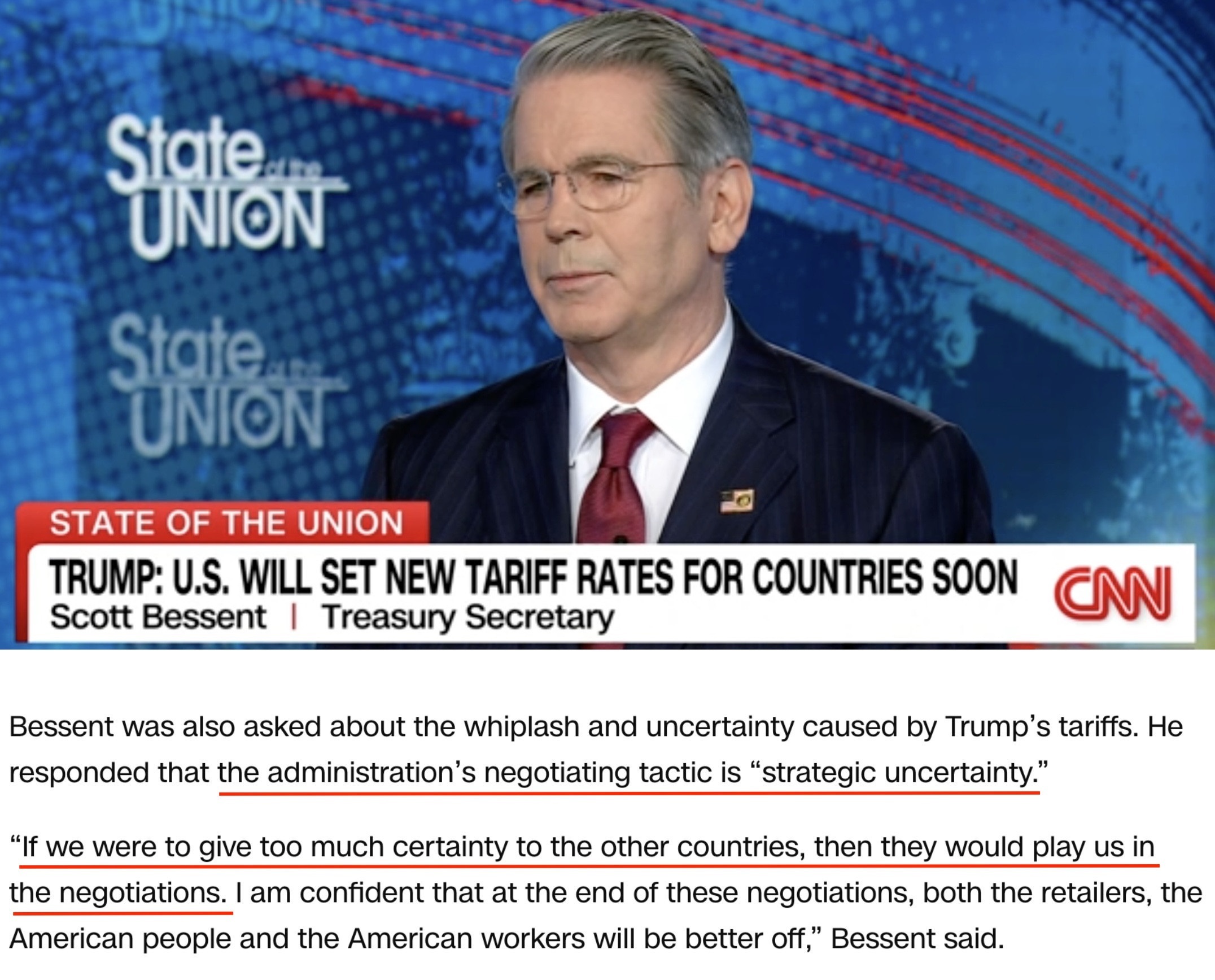 說(shuō)到美國(guó)關(guān)稅的不確定性,美國(guó)財(cái)長(zhǎng)貝森特近日接受采訪時(shí)曾有過(guò)一番“高論”。據(jù)他稱,在美國(guó)與貿(mào)易伙伴展開關(guān)稅談判之際,美國(guó)政府表現(xiàn)出的“戰(zhàn)略不確定性”是一種談判策略,而非缺點(diǎn)。