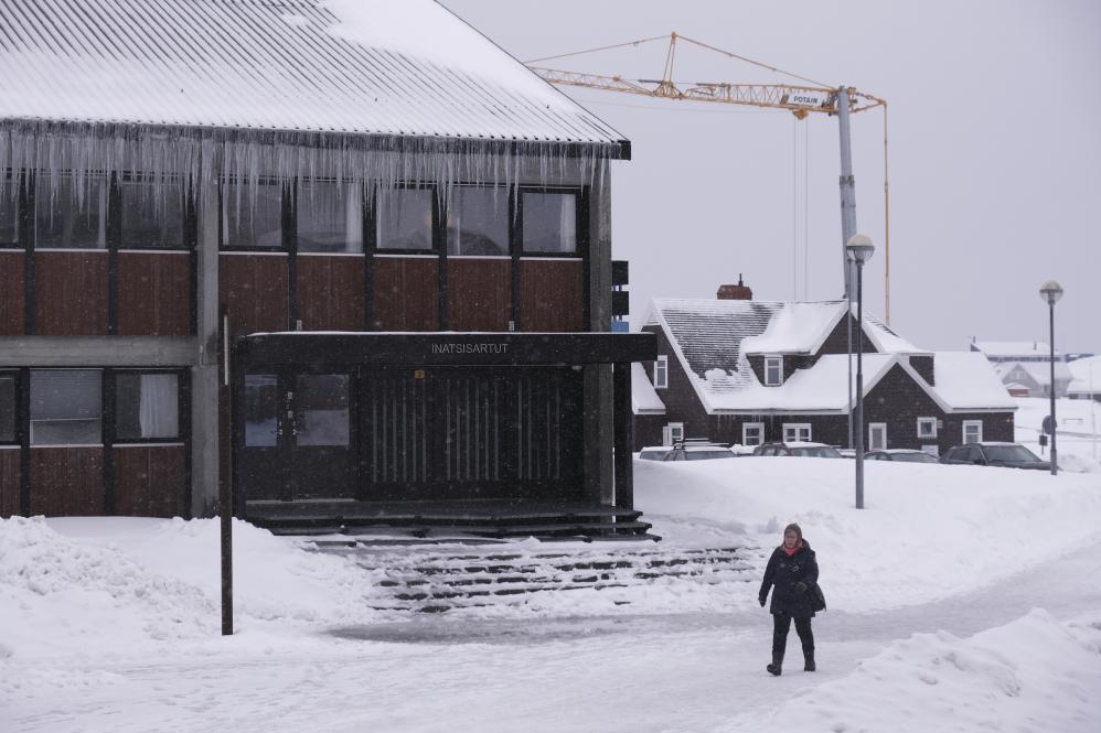 2025年3月24日,在丹麥自治領(lǐng)地格陵蘭島首府努克,一名行人經(jīng)過格陵蘭島自治議會。新華社記者張玉亮攝