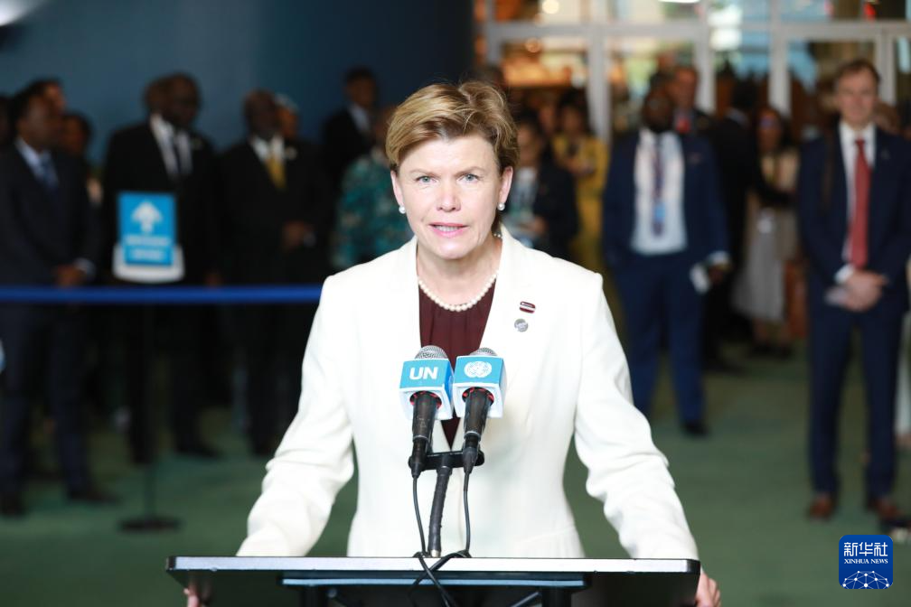 6月3日,在位于紐約的聯(lián)合國總部,拉脫維亞外長拜芭·布拉澤在拉脫維亞當(dāng)選聯(lián)合國安理會非常任理事國后講話。新華社記者 謝鍔 攝