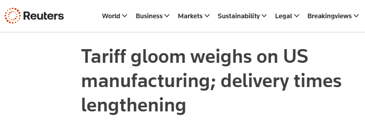 路透社近日的一篇報道認為,美國制造業(yè)5月連續(xù)第三個月萎縮,在關稅影響下,供應商交付投入的時間是近三年來最長的,這可能預示著某些商品即將出現(xiàn)短缺。