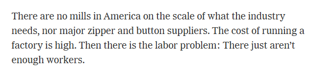 文章說,特朗普政府的高額關(guān)稅給企業(yè)帶來了巨大壓力,迫使企業(yè)的負(fù)責(zé)人一直在思考自己能在美國多生產(chǎn)多少產(chǎn)品。但是,美國既沒有滿足該行業(yè)需求的規(guī)模工廠,也沒有主要的拉鏈和紐扣供應(yīng)商。運(yùn)營工廠的成本很高。此外還有勞動力問題:工人根本不夠用。