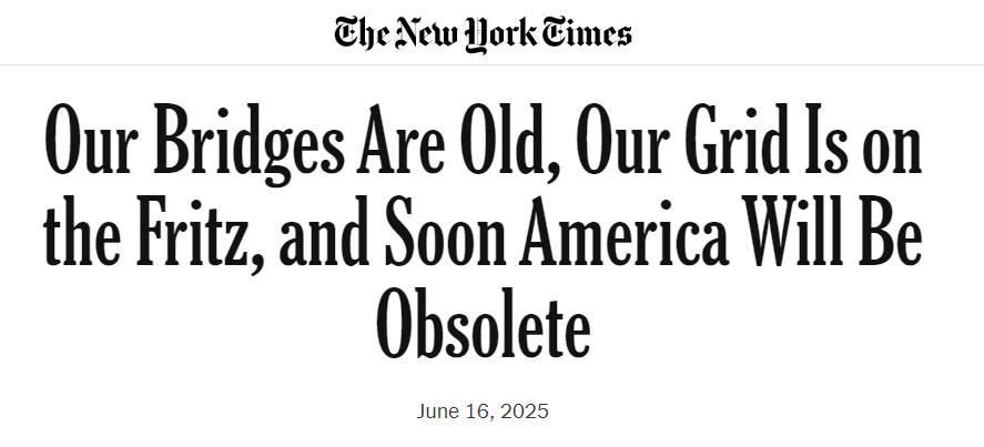《紐約時報》6月16日刊發(fā)專欄文章稱,美國的橋梁、電網(wǎng)和港口等基礎(chǔ)設(shè)施正面臨嚴(yán)重的老化與不足,美國即將被“老化淘汰”。