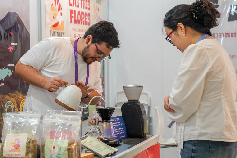 6月20日,來自薩爾瓦多的參展商(左)在咖啡產業(yè)館為顧客沖咖啡。 新華社發(fā)(彭奕凱 攝)
