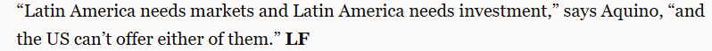 文章指出,并非所有人都對拉美與中國之間的合作感到滿意。華盛頓尤其擔心。不過,許多人認為華盛頓影響拉丁美洲的能力有限。文章援引利馬國立圣馬科斯大學的亞洲經(jīng)濟專家卡洛斯·阿基諾的話指出,“拉丁美洲需要市場和投資,但美國無法提供其中任何一項”。