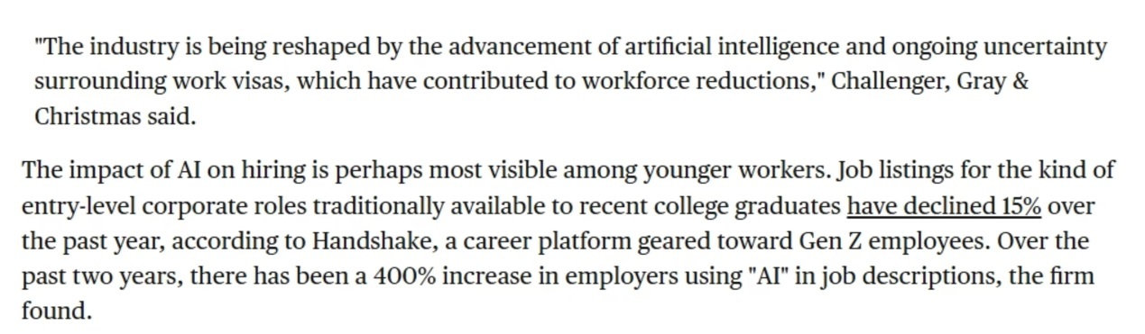報告分析,人工智能的快速進(jìn)步與工作簽證政策的不確定性,正在重塑就業(yè)格局。其中,年輕求職者首當(dāng)其沖。過去一年,美國企業(yè)面向應(yīng)屆畢業(yè)生的初級職位招聘量下降15%,而招聘要求中提及“人工智能”的崗位數(shù)量卻激增400%,凸顯技能需求結(jié)構(gòu)性轉(zhuǎn)變。